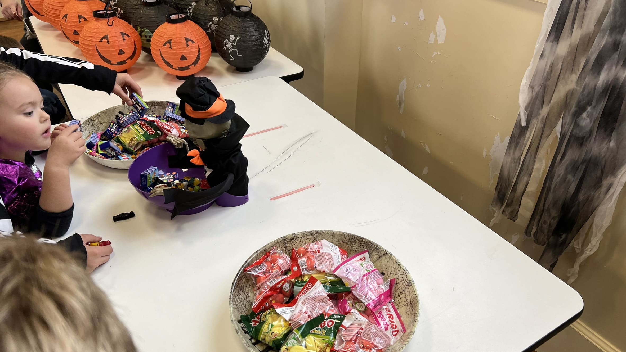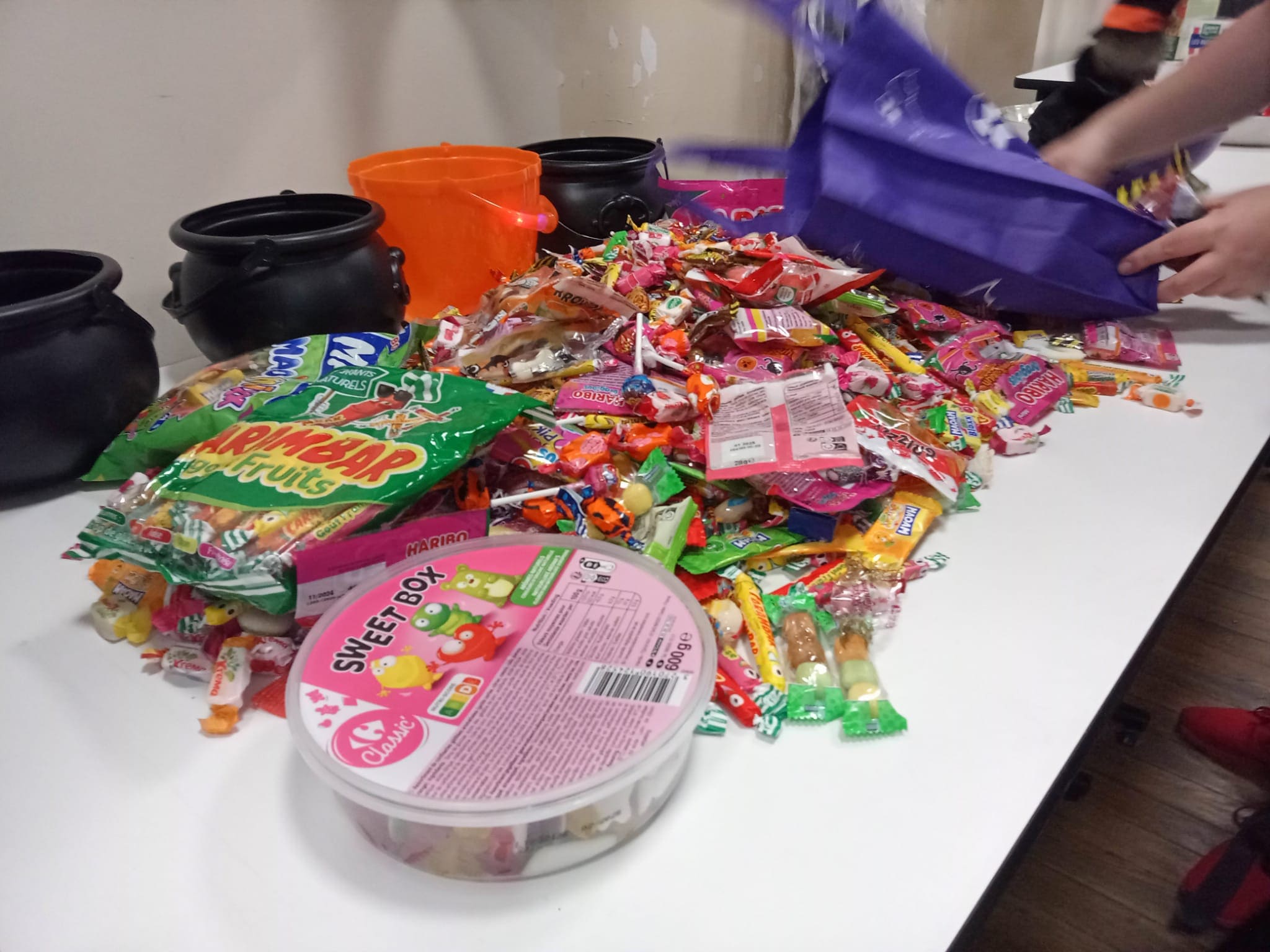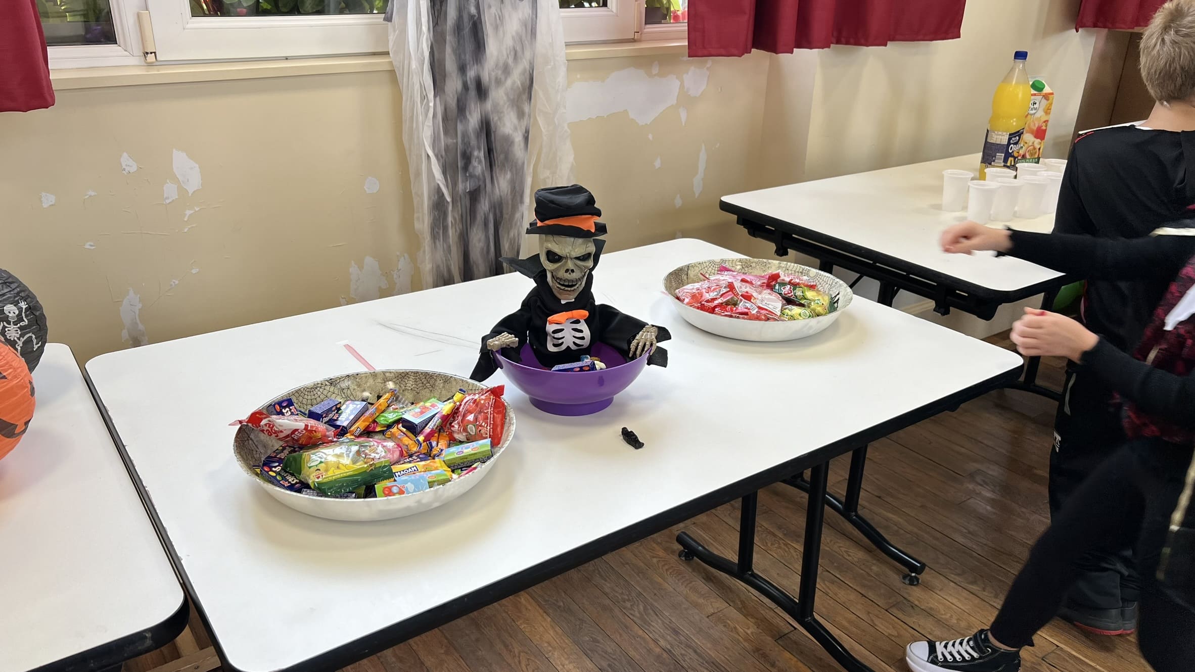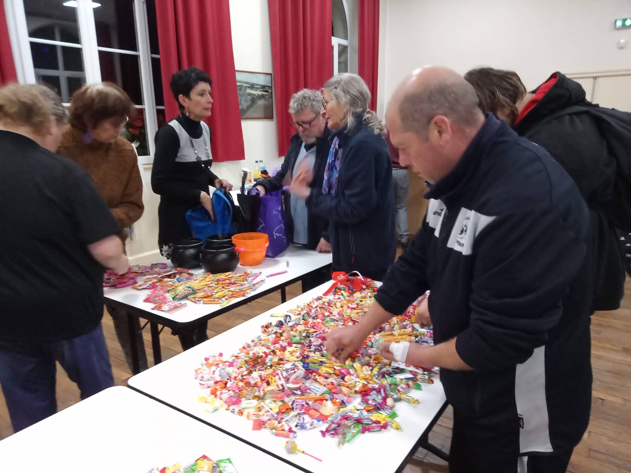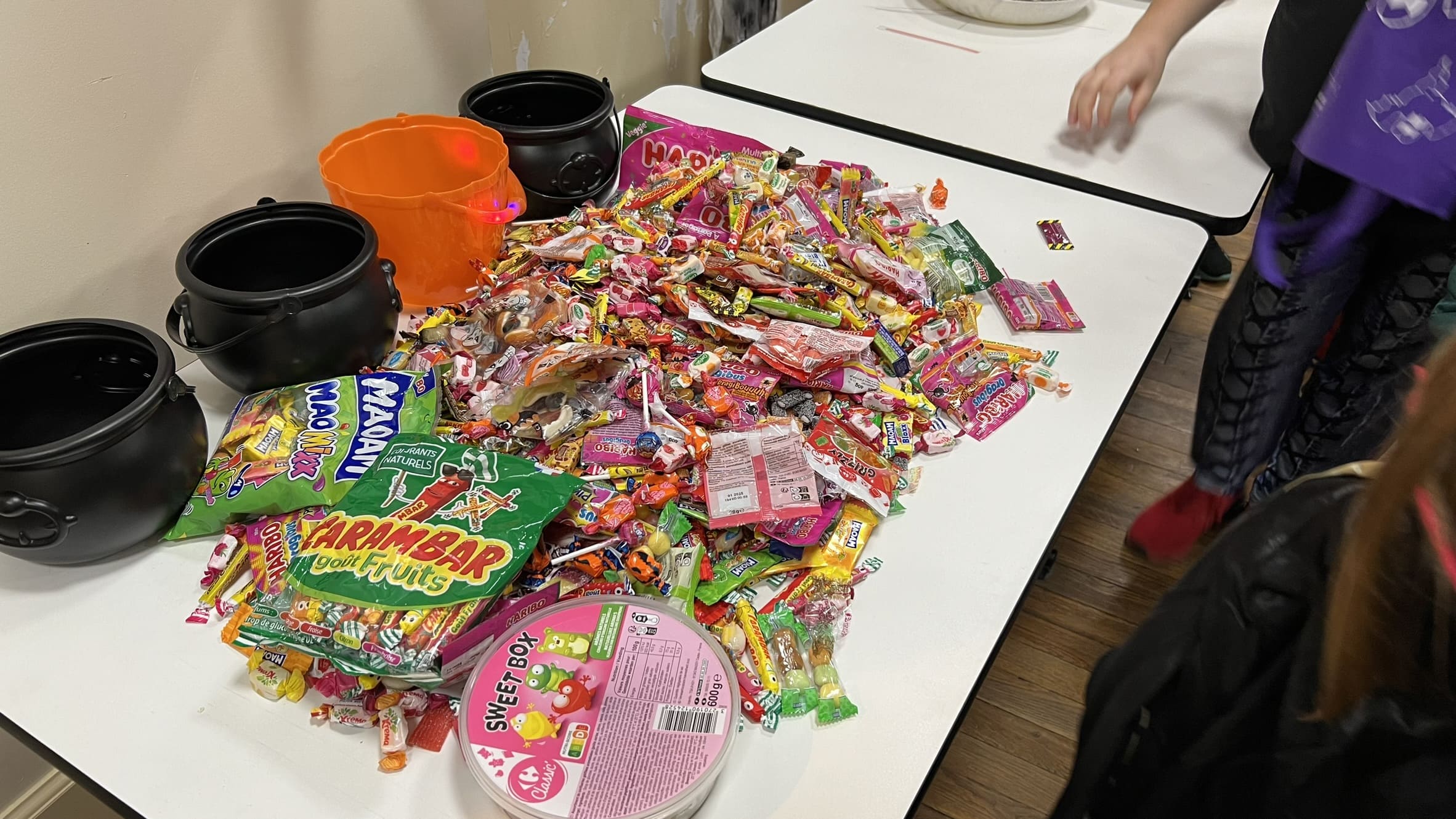 Partage des bonbons récoltés lors du défile d'Halloween.